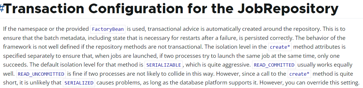 네임스페이스 또는 제공된 `FactoryBean`을 사용하는 경우 리포지토리 주변에 트랜잭션 조언이 자동으로 생성됩니다. 이는 장애 후 재시작에 필요한 상태를 포함한 배치 메타데이터가 올바르게 유지되도록 하기 위한 것입니다. 리포지토리 메서드가 트랜잭션 방식이 아닌 경우 프레임워크의 동작이 제대로 정의되지 않습니다. create*` 메서드 속성의 격리 수준은 작업이 시작될 때 두 프로세스가 동시에 동일한 작업을 시작하려고 시도하는 경우 한 프로세스만 성공하도록 하기 위해 별도로 지정됩니다. 이 메서드의 기본 격리 수준은 `SERIALIZABLE`로 매우 공격적입니다. READ_COMMITTED`도 일반적으로 똑같이 잘 작동합니다. 두 프로세스가 이런 식으로 충돌할 가능성이 없는 경우 `READ_UNCOMMITTED`도 괜찮습니다. 그러나 create* 메서드에 대한 호출은 매우 짧기 때문에 데이터베이스 플랫폼이 지원하는 한 `SERIALIZED`로 인해 문제가 발생할 가능성은 거의 없습니다. 그러나 이 설정을 재정의할 수 있습니다. Translated with DeepL.com (free version)