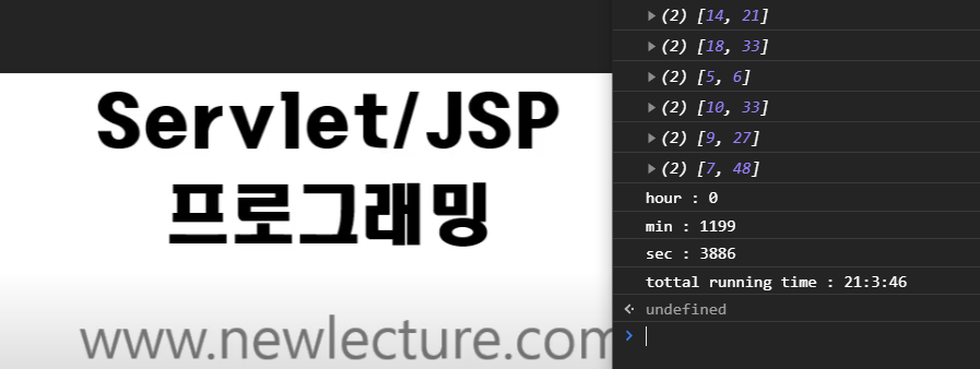 아래는 현재 내가 듣고 있는 뉴렉쳐 109강짜리 servlet, jsp 강의의 러닝 타임이다.